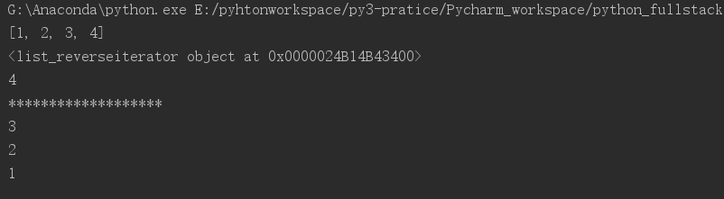 L=[1,2,3,4] L_new=reversed(L) #返回的是一个迭代器,并不会改变原有列表,会把原来列表中的元素反转,产生一个新的 print(L) print(L_new) #返回的是一个新的列表 print(L_new.__next__()) #可以使用.__next__()方法依次取得迭代器中元素的值 print("*******************") for i in L_new: #由于这个迭代器已经使用.__next__()取得一个值了,所以后续在使用for循环时也只能接着取了~ print(i)