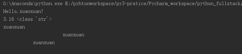 print("{},{}!".format('Hello','xuanxuan')) #格式化输出,{}相当于占位符 print(format(3.16),type(format(3.16))) #可以将数字转化为字符串 print(format('xuanxuan','<30')) #将字符串左对齐,长度30 print(format('xuanxuan','>30')) #将字符串右对齐,长度30 print(format('xuanxuan','^30')) #将字符串居中对齐,长度30