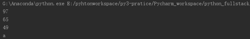 print(ord('a')) #将字符a按照unicode转化为数字97 print(ord('A')) #将字符A按照unicode转化为数字65 print(ord('1')) #将字符‘1’按照unicode转化为数字 print(chr(97)) #将数字97按照unicode转化为字符