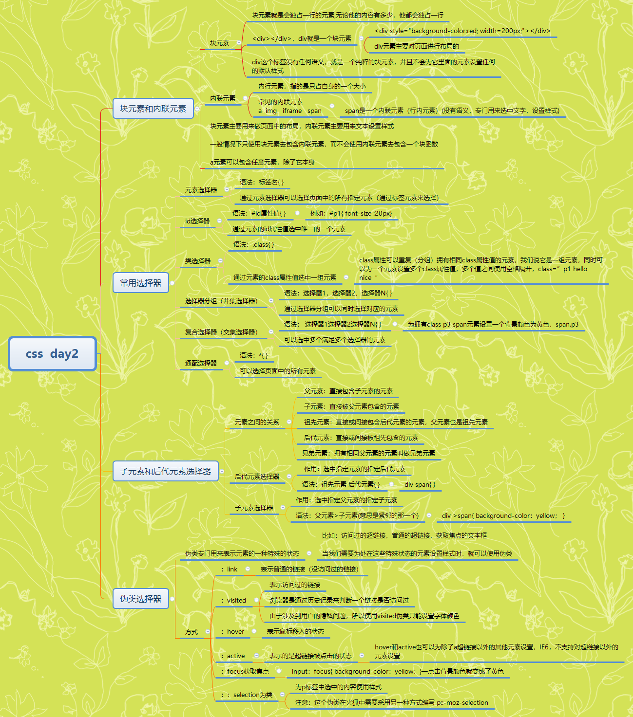 块元素和内联元素,常用选择器,子元素和后代元素选择器,伪选择器