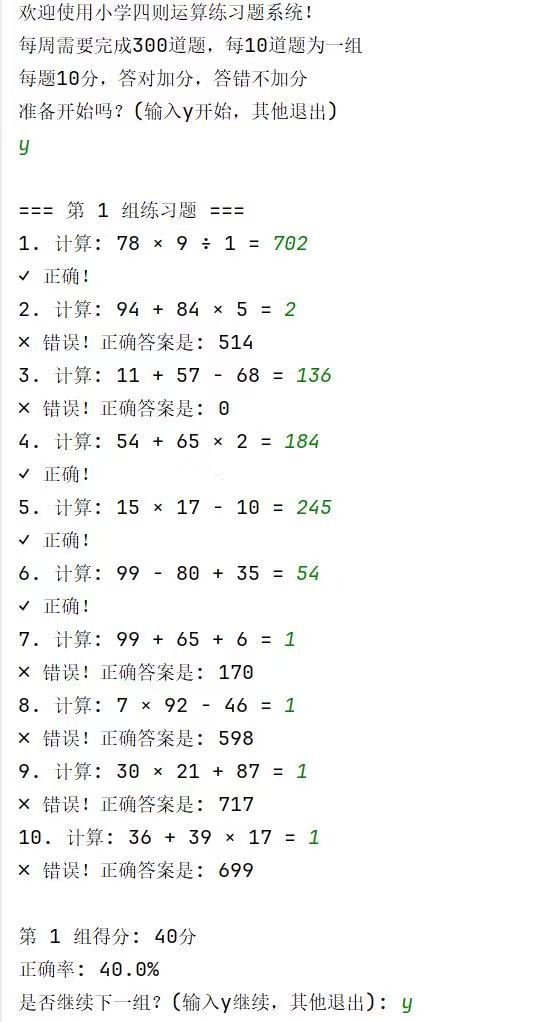 3.输出系统的欢迎信息和使用说明,接着询问用户是否准备开始。若用户输入不是 y,则退出系统。根据总题数和每组题数计算出总组数,然后通过循环依次处理每组题目。在每组题目中,通过 generateValidExpression 方法生成有效的四则运算表达式,再用 calculate 方法计算表达式的结果。接着提示用户输入答案,将用户答案与正确结果进行比较,根据比较结果输出相应信息并更新组得分和正确题数。计算每组的正确率,输出组得分和正确率。在每组结束后,询问用户是否继续下一组练习。若用户输入不是 y,则跳出循环,结束练习