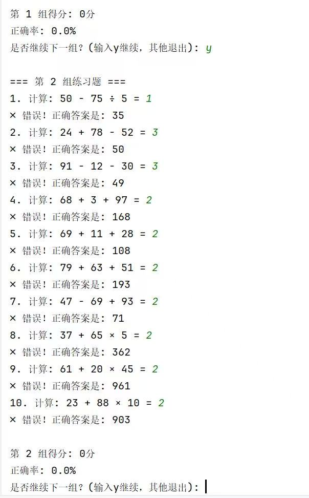 然而,开发过程也暴露出一些不足。在表达式生成环节,虽然能够保证结果在一定范围内,但生成逻辑相对简单,未考虑更多复杂情况,如括号的使用、连续相同运算符等,限制了练习题的多样性。在用户交互体验上,输入提示不够友好,缺乏错误输入的引导,可能导致用户困惑。