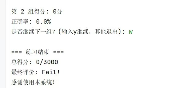 该系统借助模块化设计,将不同功能封装到不同的方法中,提高了代码的可读性和可维护性。通过循环和条件判断实现了分组练习、结果判断、评价生成等功能,同时对异常情况进行了处理,保证了系统的健壮性