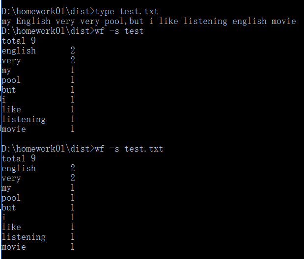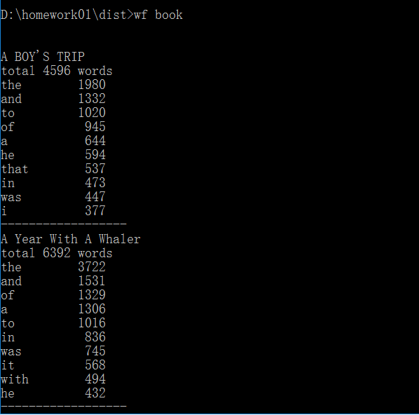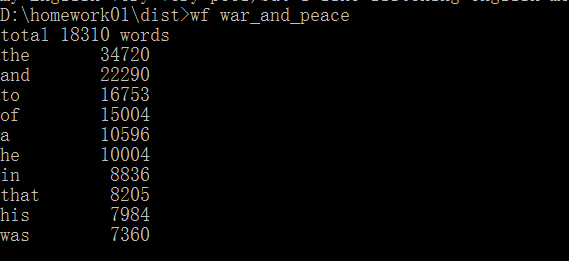 #功能2:支持命令行输入英文作品的文件名 def count_words02(name): # 判断传入的命令行参数后缀部分是否含有.txt d=".txt" if d in name: path=name else: #若没有,要加上,再作为打开路径 path=name+d f=open(path,"r",encoding="utf-8") lists=findall(r"[a-z0-9^-]+",f.read().lower())#通过正则表达式和findall()函数生成文件内容的列表 words=Counter(lists) #遍历字典,统计键值对数 num=0 for key,value in words.items(): num+=1 #功能1不输出words,功能2输出words if sys.argv[1]=="-s": print("total"+" "+str(num)) else: print("total"+" "+str(num)+" words") #most_common(n)返回计数值最大的n个元素的元素列表 maxwords=words.most_common(10) for i in maxwords: print("%-10s%5d"%(i[0],i[1]))