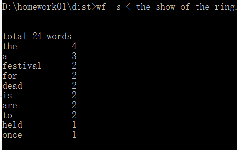 其实开始看这个功能4时,我还蒙,但是看了一下测试用例,我慢慢明白了,首先确定 the_show_of_the_ring是一个文件,其次哪个>wf -s < the_show_of_the_ring,这个<符号是一个重定向符,-s是添加的区别于其他功能的标志,所以题意是统计重定向的文件的单词个数。