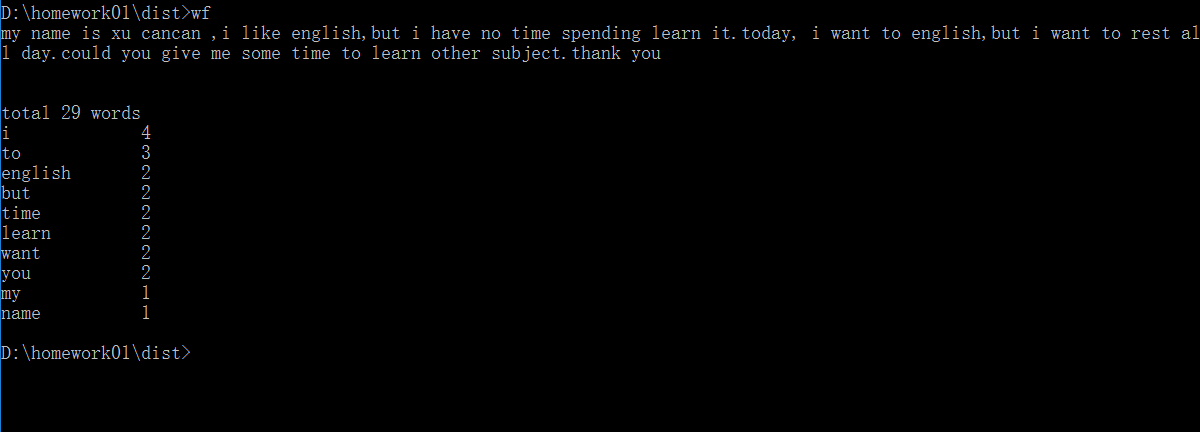 #功能4:重定向 def count_words03(string): print("\n") lists = string.replace('\n', ' ').lower().split() # 用空格去掉所有的\n,且转换成小写,进行分割单词 words=Counter(lists) #Counter函数是用来跟踪值出现的次数,以字典的键值对形式存储,其中元素为key,其计数为value #遍历字典,统计键值对数 num=0 for key,value in words.items(): num+=1 print("total"+" "+str(num)+" words") #most_common(n)返回计数值最大的n个元素的元素列表 maxwords=words.most_common(10) for i in maxwords: print("%-10s%5d"%(i[0],i[1])) #定义main函数 def main(argv): #功能4:输入一篇文章统计单词字数 if(len(argv)==1): str = input() str = re.sub('[^a-zA-Z]',' ',str) #sub()函数将不为字母的替换空格 count_words03(str) #功能1和功能4 elif sys.argv[1]=='-s': if(len(argv) == 3): #执行功能1 #print(sys.argv[2]) count_words(sys.argv[2]) elif(len(argv)==2): #执行功能4:重新定向文件 redirect_words = sys.stdin.readline() # 存储重定向的文件名接着去读这个文件的内容,返回这个文件的内容 redirect_words= re.sub('[^a-zA-Z]',' ',redirect_words) count_words03(redirect_words)