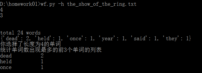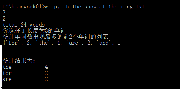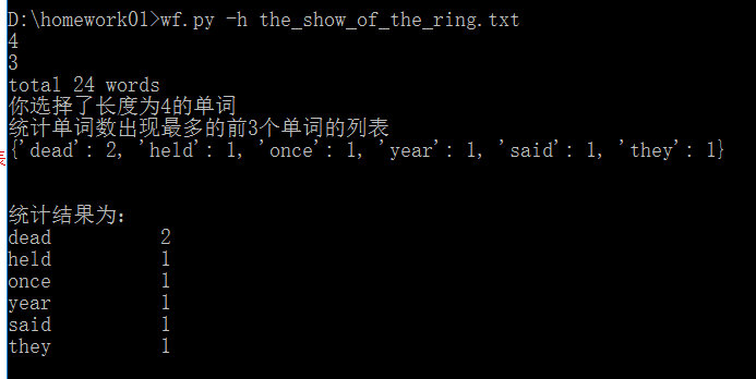 #功能5: 在文件中统计给定的单词长度为m的次数前n个的单词 if(sys.argv[1]=="-h"): str1=input() a=int((str1.strip())) str2=input() b=int((str2.strip()))) count_words04(sys.argv[2],a,b)