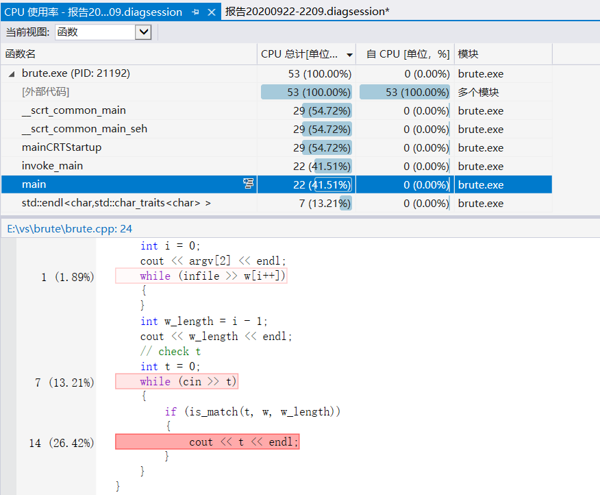 由上图可知:brute.cpp程序的输入和输出造成程序占用的cpu较大。输出的cpu的占用率达到了26.4,占比更大,导致程序变慢。