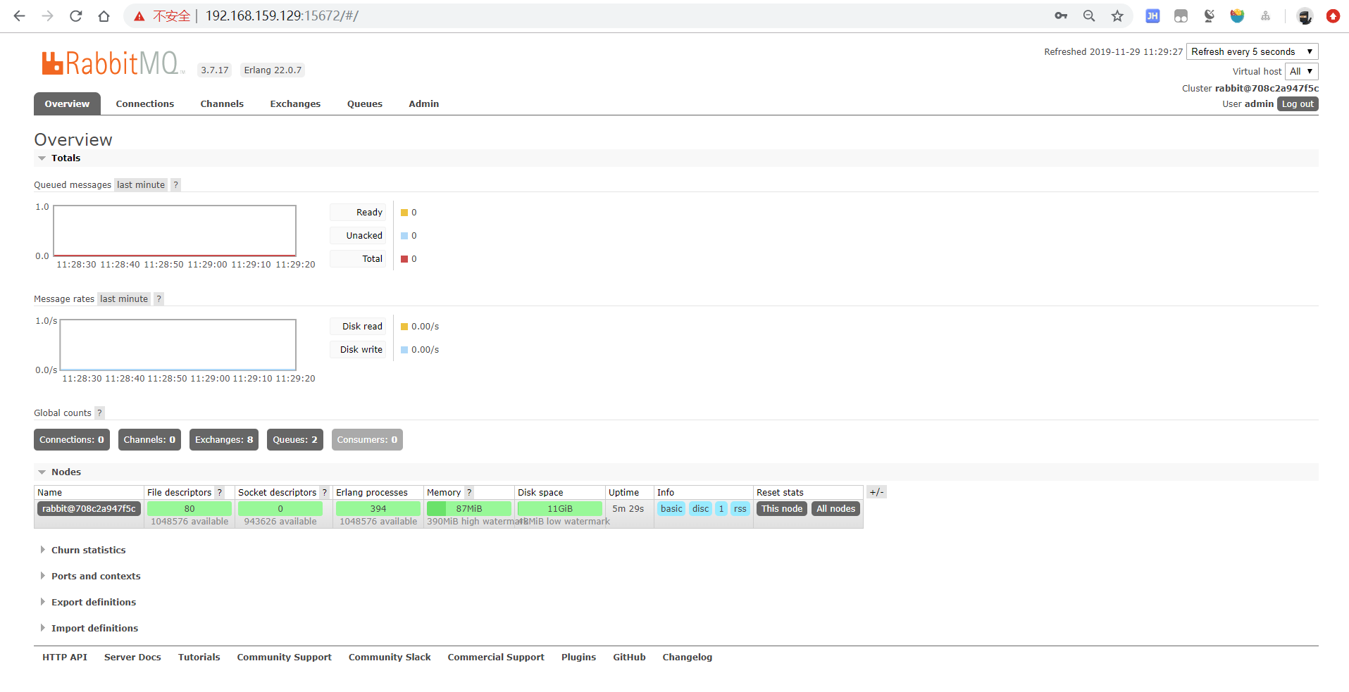 等待下载完镜像并启动后,打开 rabbitMQ 的 web 控制台 http://localhost:15672/