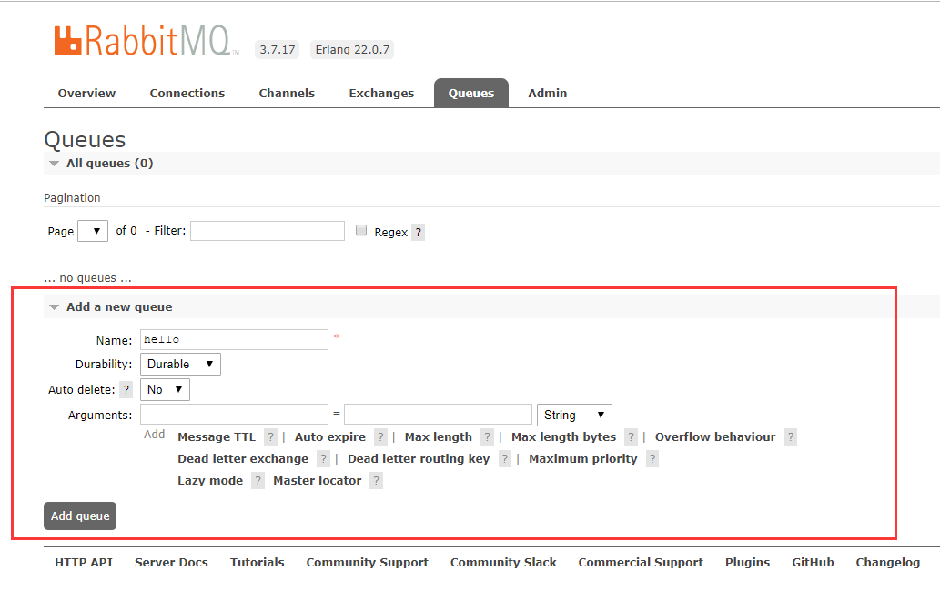 Auto delete:1.No 2.Yes 如果 Yes,队列将在至少一个消费者连接之后删除自己,然后所有消费者断开连接。