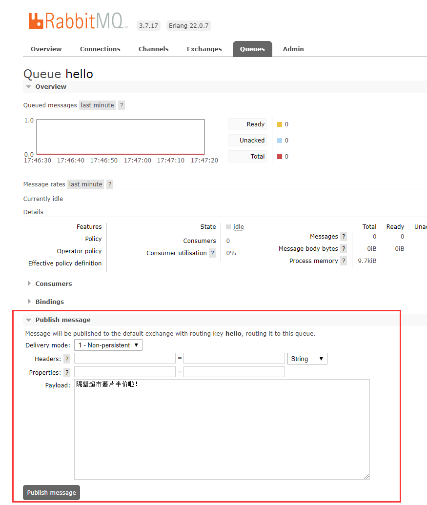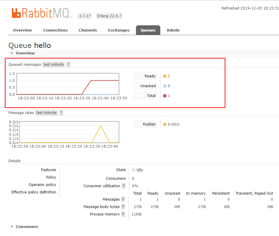 发布成功后,我们可以看到在队列里保存了一条消息:
