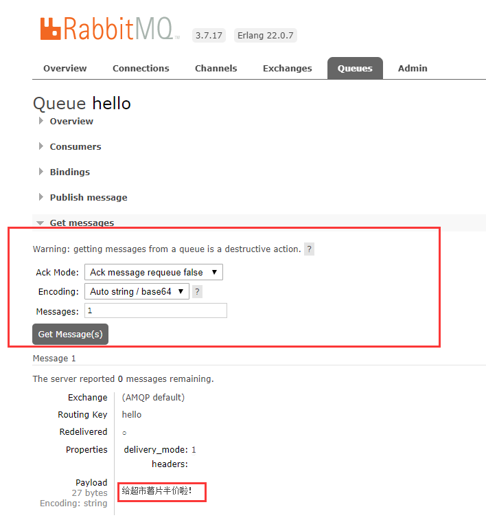 在队列获取消息是一个破坏性的操作,但是我们为了便于直观学习,在此进行页面消费信息。