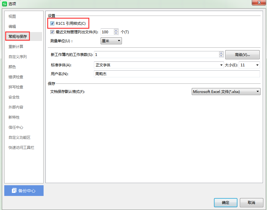 可点击左上角文件“选项”-“常规与保存”,勾选“R1C1引用样式”即可