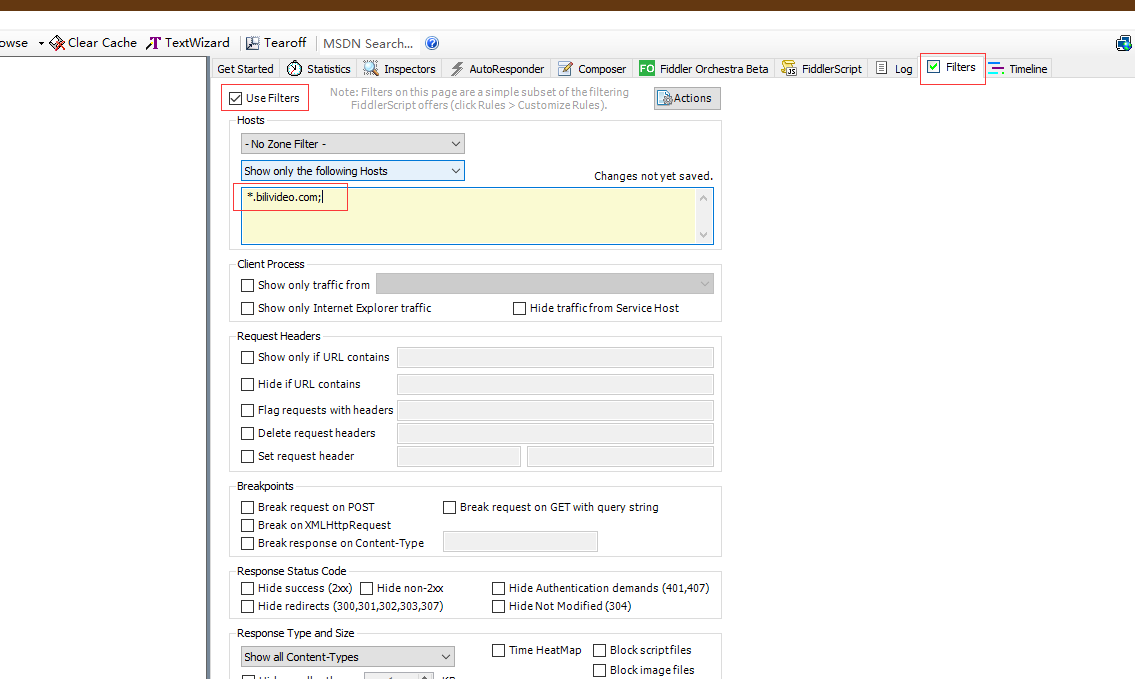 1:打开Fiddler、设置过滤B站视频资源DNS,可能还有其他DNS