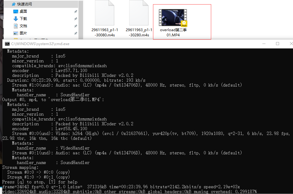 根据文件名输入指令: ffmpeg -i 29611963_p1-1-30080.m4s -i 29611963_p1-1-30280.m4s -codec copy overload第二季01.MP4
