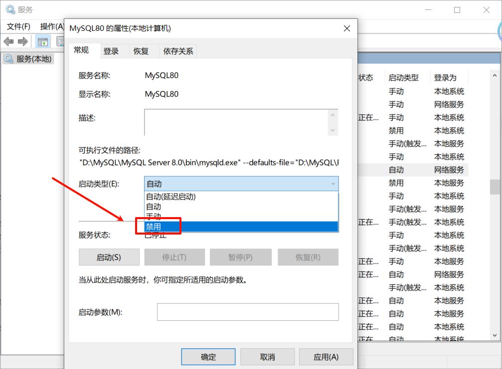 如果想要阻止开机自启,或者避免每次需要关闭一次,可以双击MySQL80,将启动类型设置为禁用