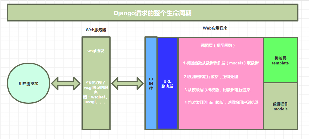 发请求———>url匹配———>视图函数———>取数据———>返回到模板———>数据渲染———>页面展示