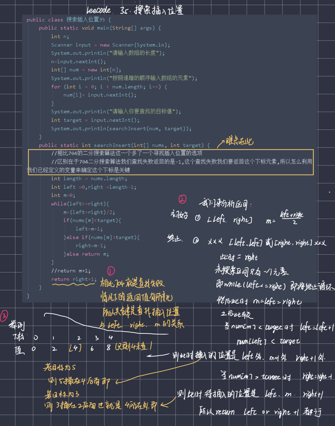 - 相比704的二分搜索算法这一个多了一个寻找插入位置的选项