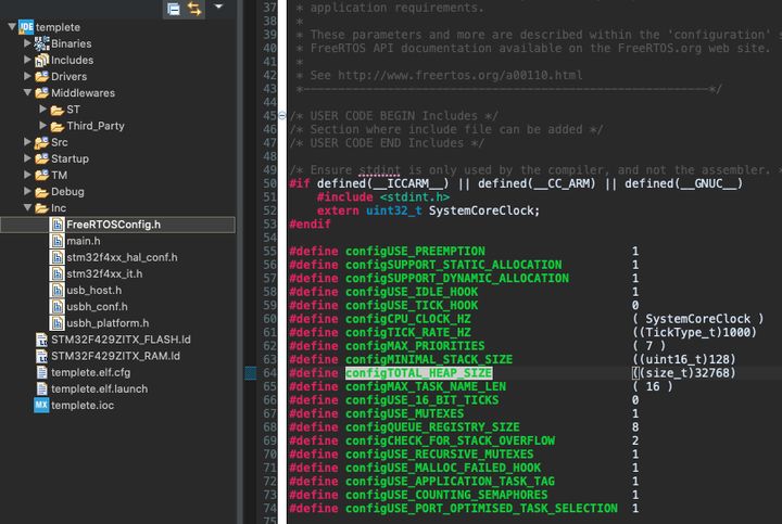 本方案使用标准库里的malloc和free函数,所以堆的大小由链接器配置决定,不受configTOTAL_HEAP_SIZE大小影响。