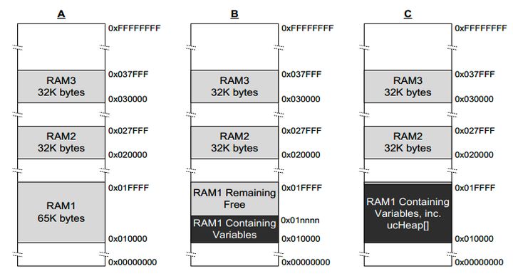 FreeRTOS早期的版本使用内存池分配方案(memory pool allocation)。内存池分配是指在程序编译阶段就分配一定数量的内存块留作备用。当有新的内存需求时,就从内存块分出一部分内存块,若内存块不够了就继续申请新的内存。这样做的一个显著优点是尽量避免了内存碎片,使得内存分配效率得到了提高。然而因为内存池分配对RAM的使用效率底下,在新的版本这个方案已经不被采用。