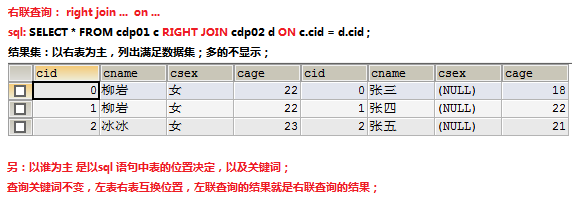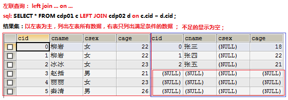 sql语句:SELECT * FROM cdp01 c INNER JOIN cdp02 d ON c.cid = d.cid ;
