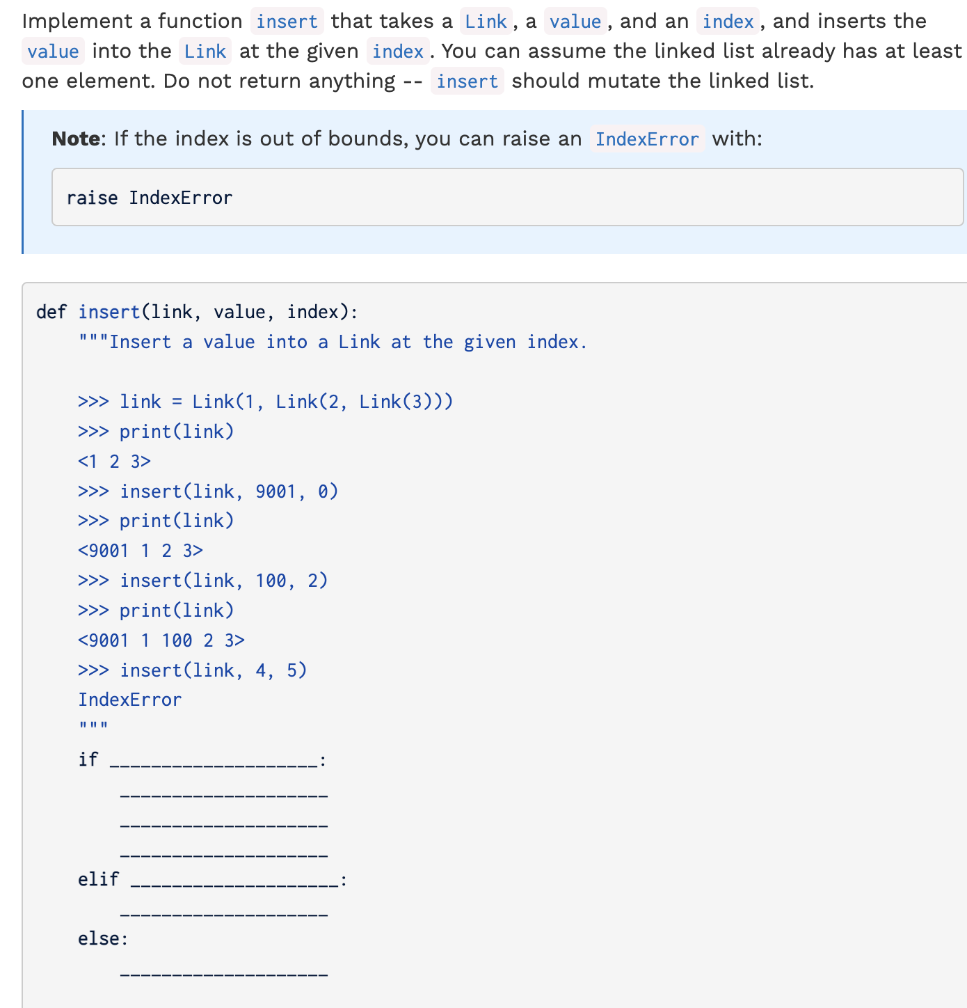 def insert(link, value, index): """Insert a value into a Link at the given index. >>> link = Link(1, Link(2, Link(3))) >>> print(link) <1 2 3> >>> insert(link, 9001, 0) >>> print(link) <9001 1 2 3> >>> insert(link, 100, 2) >>> print(link) <9001 1 100 2 3> >>> insert(link, 4, 5) IndexError """ if index == 0: temp = Link(link.first, link.rest) link.first = value link.rest = temp elif link.rest is Link.empty: raise IndexError else: link.reset = insert(link.rest, value, index-1)