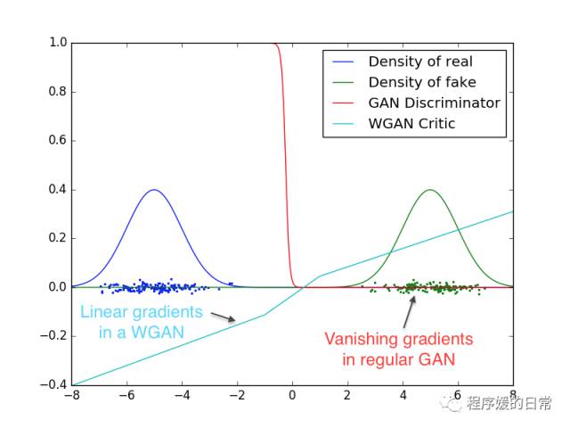 从上图可以看到,WGAN 的 D 的导数很平滑(也就是所谓的 WGAN Critic,浅蓝色线),而原始的 GAN 的梯度消失很严重(红色线)。也就是说,有了基于 Wasserstein distance 的 WGAN,原始 GAN 中的难点二,梯度消失问题就解决了。