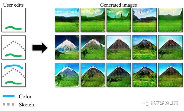 有了 GAN,以后就不怕灵魂画手了!左边这么简单的“简笔画”,居然也可以直接生成出对应的蕴含丰富含义的完整图画呢。这个工作来自[24],同时还可以用来做一些修正,比如可以把春天的山变成被白雪覆盖尖端的山——而这一切只需要一点点白色的涂抹(可以参考这个工作[24]的官方页面)。