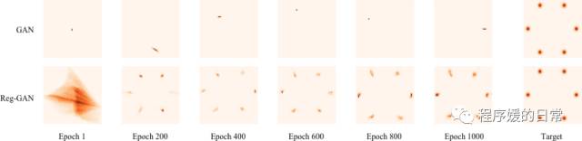在一个模拟实验上可以看到,没有编码器的原始 GAN 会非常难以拟合多个分散的 mode,而加入了编码器的 regularized GAN 则非常容易: