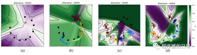 上图中 (a) 是原始数据分布,(b) 是普通 GAN,(c) 是加了单向映射的 GAN,(d) 是 DiscoGAN。(c) (d) 都区分出了一定程度的 mode,但 (c) 还是 miss 掉了一些(右上角绿色背景的)。而 (d) 则完美地区分了10个 mode,并且从背景色来看(背景色代表判别器 D 的输出),判别器对于同一种 mode 的输出非常一致,几乎没有渐变色,这也说明了 DiscoGAN 的训练优势。综上,这些基于编码器的工作都可以认为几乎解决了 GAN 训练难点三:替代目标函数不合理,一定程度解决了 JS 散度在两个分布几乎不重叠时候的问题。