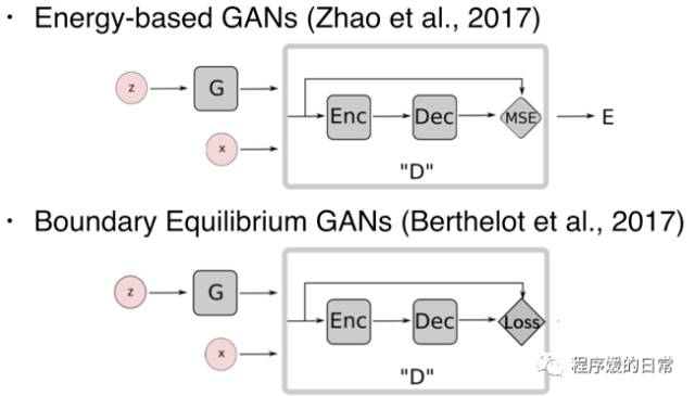 同时期还有许多相似的工作,比如 EBGAN[4] 和 BEGAN[5]。两篇工作非常相似,EBGAN 将能量函数作为判别器 D 的输出;而 BEGAN 则将这一条件“简化”。