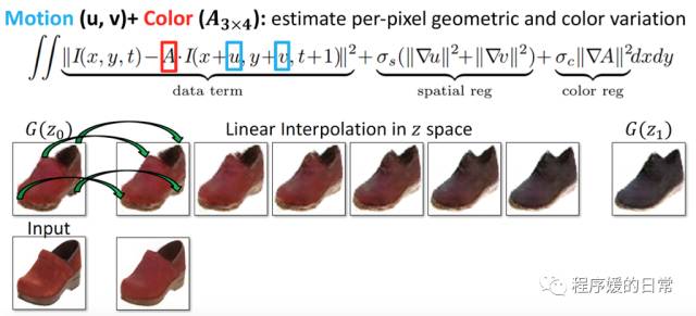第三个工作是来自 UC Berkeley 的 iGAN/GVM[24],也是开篇介绍 GAN 应用中的解放灵魂画手的工作。他们的工作中蕴含了两种指导信息,一个是用户的输入,比如蓝色的笔触,比如绿色的线条,比如图像改变的方向和程度(拉伸、变形)。但是如果只利用这样的信息,生成的图像往往比较模糊,比如鞋子的纹理变得不够清晰。为此它们的解决办法是为在生成的鞋子的形状上“贴”上原始真实图片中的高清纹理。所以难点就是如何让“贴”的过程变得可靠,不能“贴”出区域,也不能“贴”少了。他们在此利用了差值空间中的光场信息,从而能捕捉到相邻差值空间中的点对点映射关系,也就可以基于这样的映射,迭代“贴”上纹理,直到最后一步: