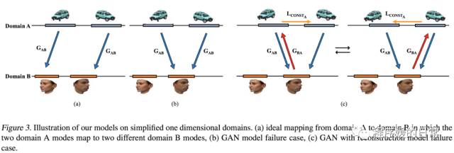 我们人类之所以可以做到这件事,作者假设,在两个领域(X,Y)之间,是存在一种底层的关系的,或者说隐含的关联——这种隐含的关联可能是,对于同一个事物,有两种不同的映射后的表达,那么这两种表达之间就是针对这同一个事物的一种关联。如果我们仅用一个映射把 G: X->Y 进行单向映射,那么我们无法保证这个 G 是单一的。或者说,我们无法保证 X 中的所有样本 x 和 Y 领域中的所有样本 y 是合理对应的。这也就(可能)导致 mode collpase 的问题。对于这个问题的描述,在 CycleGAN 中,作者用了 meaningful 这个词;而在 DiscoGAN 中,作者强调了我们希望的是 one-to-one mapping, rather than many-to-one mapping。