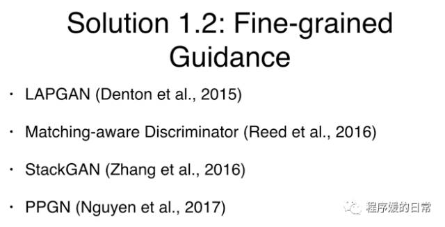 这些现象其实是 GAN 中存在的三个难点或者说问题交织导致的。个人觉得,首当其中的难点一就是,深度神经网络自身的难训练和不稳定。虽然原始 GAN 的理论中,并不要求 G 和 D 都是神经网络,只需要是能拟合相应生成和判别的函数就可以。但是这恰好是深度神经网络擅长的事情嘛,所以大家就都用神经网络作为 G 和 D 了。但是神经网络的选择、设计和训练还充满了艺术的惊喜与生活的不确定性,这也直接为 GAN 的训练带来了困难。加之本来 GAN 就缺乏指导,所以就有了一系列可以被归结为解决这一方向问题的工作。我将这类工作概括为 Partial Guidance, Fine-Grained Guidance 和 Special Architecture。