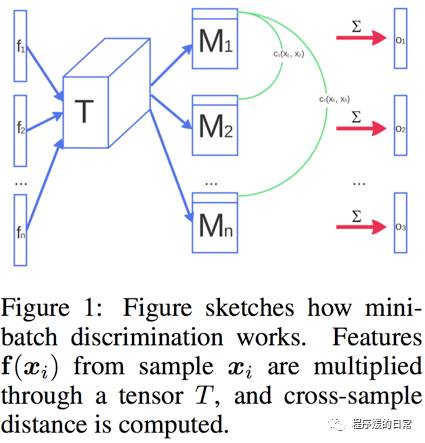 也就是说,现在的 D 直接就是神经网络的某一个中间层了。这个方法在实验中发现对于训练的稳定度提升非常有帮助。与此同时,他们还提出了第二个方法,叫 minibatch discrimination: