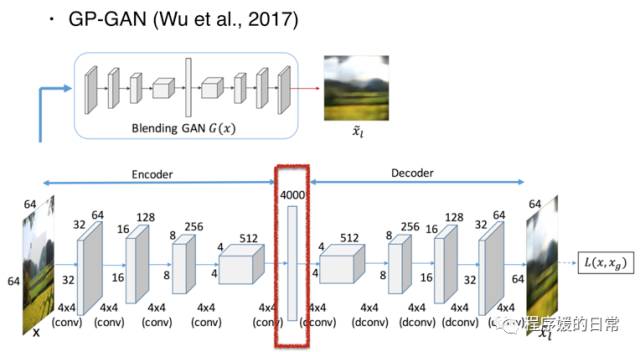 最后要指出的也是刚才就提到的 GP-GAN[25] 的工作。在这个工作中,它们提出了 blending GAN 的模块,虽然也是基于 encoder-decoder 的结构,但是略有不同的地方是,在两者中间加入了一个 fully-connected layer:
