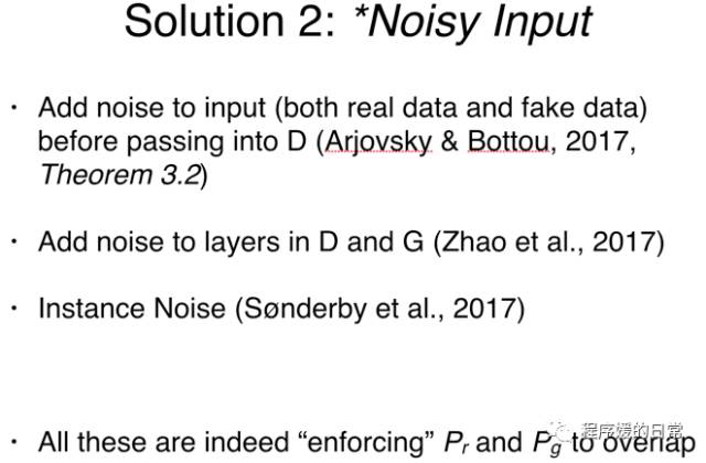 在论文[1] 中,作者们就指出,如果给 P_g 和 P_r 都加入非常小的噪音,那么它们从完全不重合到重合,从而其 JS 散度也会变得有意义。虽然这篇论文[1] 到2016年底才被提出,但相似的技巧早在之前的工作中就被人运用过。比如在 G 和 D 的神经网络中间层中加入噪音[4],或者直接在图片输入加入噪音[6] 等等。