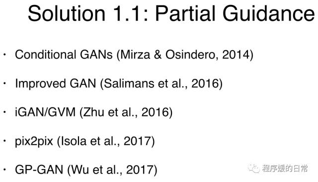 先来看,Partial Guidance。Partial Guidance 中我概括的几个重要工作,都是为原始 GAN 加上一些显式的外部信息,比如用户的额外输入,比如类别信息等等。包含的工作有:
