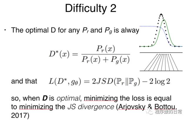 有了最优的 D* 的表达,就可以将它带入原始的 D 的目标函数,从而得到上页 slides 中的等价表达。也就是说,在 GAN 原始论文[2] 中就已经给出了,优化这样一个目标函数等价于优化 JS 散度(因为 2log2 是常数)。