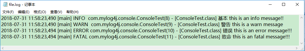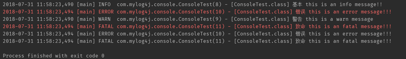 1 import org.apache.log4j.Logger; 2 public class ConsoleTest { 3 4 private static Logger logger = Logger.getLogger(ConsoleTest.class); 5 public static void main(String[] args) { 6 logger.debug("调试 this is a debug message"); 7 logger.info("基本 this is an info message!!"); 8 logger.warn("警告 this is a warn message"); 9 logger.error("错误 this is an error message!!!"); 10 logger.fatal("致命 this is an fatal message!!!"); 11 } 12 }