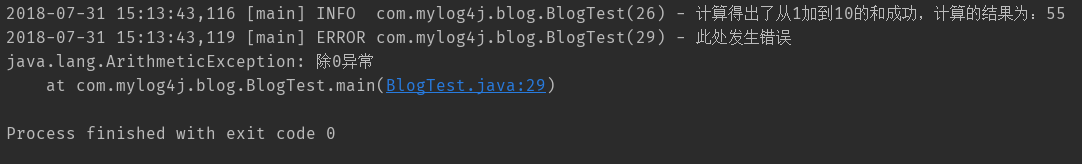 1 import org.apache.commons.logging.Log; 2 import org.apache.commons.logging.LogFactory; 3 4 public class BlogTest { 5 6 /** 7 * 得到log记录器的三种方式: 8 * 1. 通过Log工厂:LogFactory。导包:commons-logging-1.1.3.jar, Log也是该包下的对应的类。 9 * 2. 通过Logger的静态方法,有两种方式:导包:log4j-1.2.15.jar。 10 * 1)参数为配置的输出目的地名称appenderName(见后面配置中) 11 * 2)参数类对应为当前类的Class对象。 12 */ 13 private static final Log logger = LogFactory.getLog(BlogTest.class); 14 // private static Logger logger = Logger.getLogger("Console"); 15 // private static Logger logger = Logger.getLogger(BlogTest.class); 16 17 public static void main(String[] args) { 18 int sum = 0; 19 try { 20 for(int i = 1; i < 11; i++){ 21 sum += i; 22 } 23 logger.info("计算得出了从1加到10的和成功,计算的结果为:" + sum); 24 int dev = sum / 0; 25 } catch (Exception e) { 26 logger.error("此处发生错误",new ArithmeticException("除0异常")); 27 } 28 } 29 }