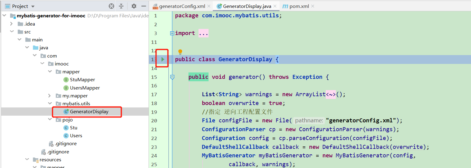 逆向工程运行(运行前需要配置):打开GeneratorDisplay.java,直接运行就可以