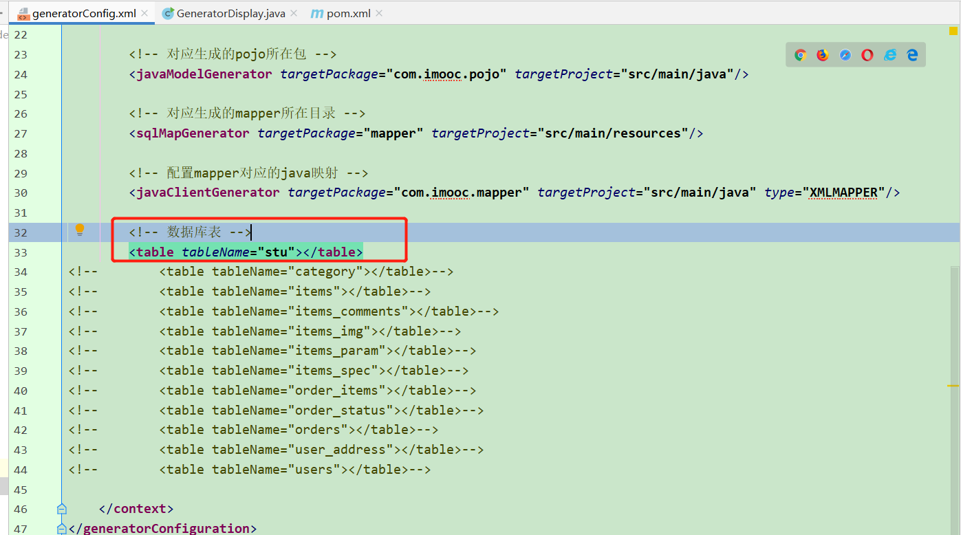 - 2.配置想要生成实体对应的表,同样在文件generatorConfig.xml中。其中stu为表名