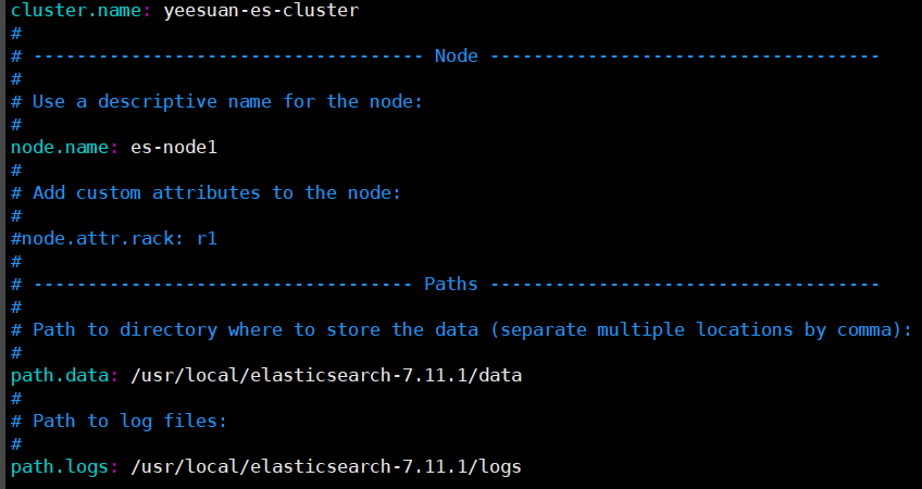 // 进入目录 cd /usr/local/elasticsearch-7.11.1/config vim elasticsearch.yml