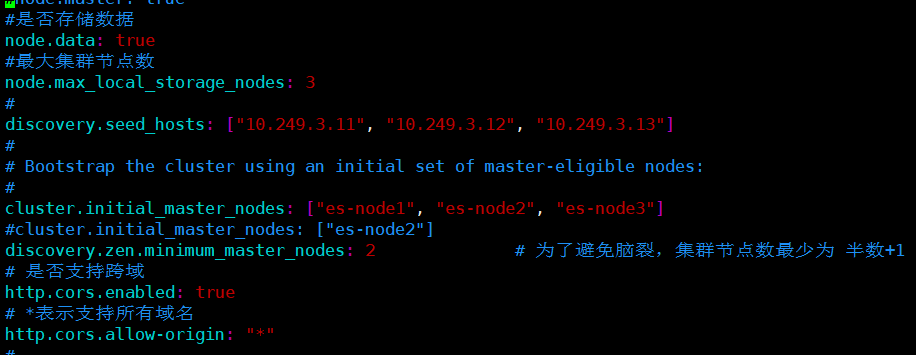 cluster.name: yeesuan-es-cluster # 节点名称(三台机器名称不同) node.name: es-node1 # 数据路径 path.data: /usr/local/elasticsearch-7.11.1/data # 日志路径 path.logs: /usr/local/elasticsearch-7.11.1/logs # ES默认开启了内存地址锁定,为了避免内存交换提高性能。但是Centos6不支持SecComp功能,启动会报错,所以需要将其设置为false bootstrap.memory_lock: false # 允许所有的网络访问 network.host: 0.0.0.0 #是否存储数据,三台机器都设置为true node.data: true #最大集群节点数 node.max_local_storage_nodes: 3 # 三台节点的ip discovery.seed_hosts: ["11.249.3.11", "11.249.3.12", "11.249.3.13"] # 是否允许选举主节点,三台节点的名称 cluster.initial_master_nodes: ["es-node1", "es-node2", "es-node3"] discovery.zen.minimum_master_nodes: 2 # 为了避免脑裂,集群节点数最少为 半数+1 # 是否支持跨域 http.cors.enabled: true # *表示支持所有域名 http.cors.allow-origin: "*"