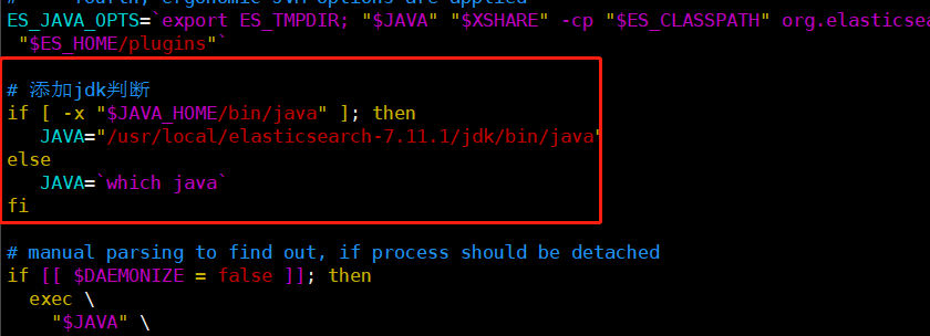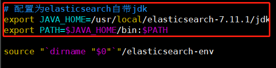 由于我这边环境JDK使用的1.8,而ElasticSearch7.11.1要求JDK版本必须为JDK11+,否则启动会报错,在这种情况下如想在不升级环境JDK版本下启动ES需修改ES的JDK配置,其实ElasticSearch7.X安装包中都自带有JDK(系统无配置JDK环境变量时启动会使用自带JDK),我这里通过修改bin目录下elasticsearch和elasticsearch-cli来指向自带JDK。