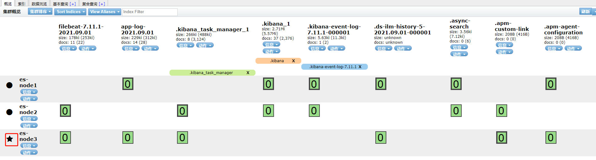 使用Chrome插件来访问,如下图,有三台节点。其中es-node3是主节点(前面有个星号)