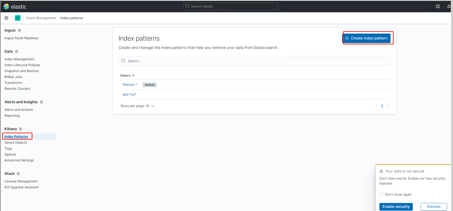 2.选择index pattern --》create index pattern,创建一个新的index