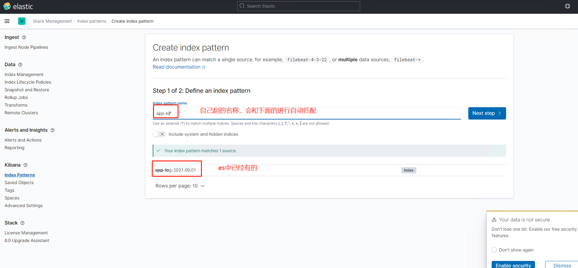 3.填写名称,在填写的时候,会自动匹配,假如说elasticsearch中没有数据的话,会显示为空。然后点击下一步