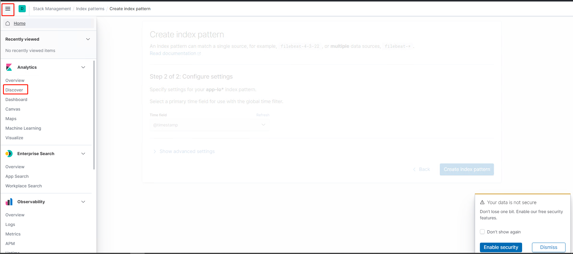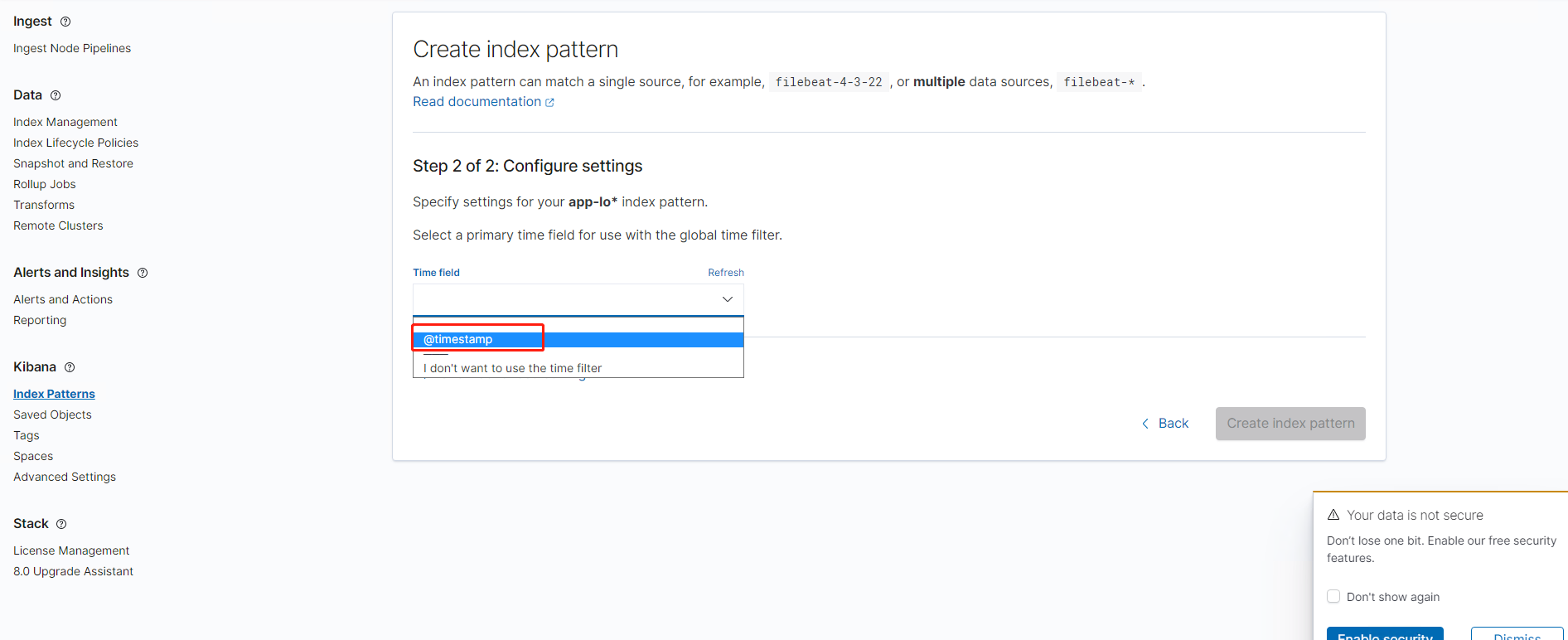 4.选择@timestamp,然后点击create index pattern。这样就创建完成了